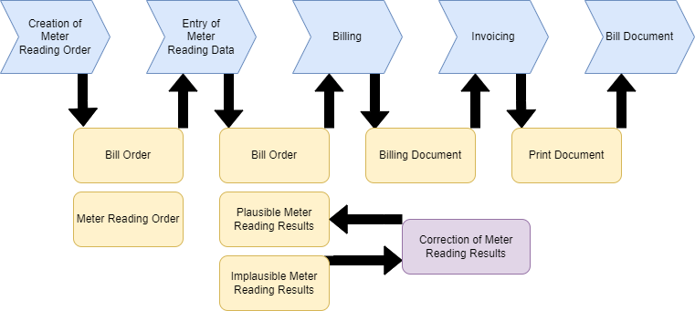 - A meter reading order is created to capture the meter readings. This results in generating a Bill order as well as a meter reading order.
